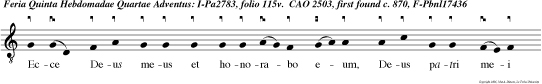 | Antiphon 5: CAO 2503 Ecce Deus meus et honorabo eum, Deus patri mei et exaltabo eum. |