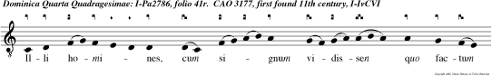 | Antiphon : CAO 3177 Illi homines, cum signum vidissen quo factum fuerat, glorificaban Deum, et diceban Qui a hic est Salvator mun di. |