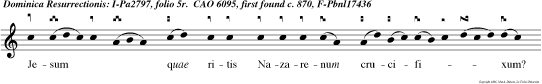 | Responsory 2: CAO 6095 Angelus Domini locutus est mulieribus dicens: Quem quaeritis? an Jesum quaeritis? iam surrexit: Venite et videte, alleluia, alleluia. |
