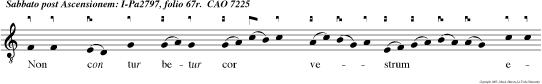 | Responsory 3: CAO 7723 Super muros tuos, Jerusalem, con stitui custodes: tota die et nocte non tacebunt Laudantes nomen Domini. |