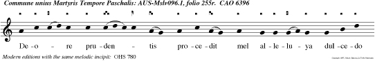 | Responsory 2: CAO 6396 Deore prudentis procedit mel alleluya dulcedo mellis est lingua eius alleluya Favus distillans labia eius alleluya alleluya. |