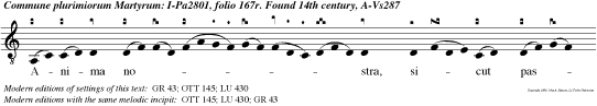 | Antiphon : CAO 2927 Gaudent in ce lis anime sanctorum qui chri sti vestigia sun secuti et quia pro eius amore sanguinem suum fuderunt ideo cum chri sto regnabunt in eternum. |