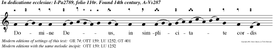 | Responsory 2: CAO 6756 Fundata est domus domini super ver ticem monti um et exaltata est super omnes col les et venient ad eam omnes gen tes. Et dicent gloria ti bi domi ne. |