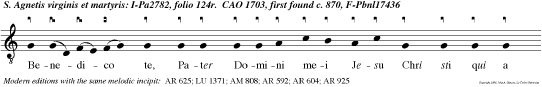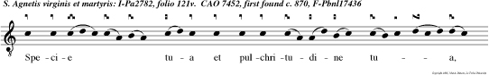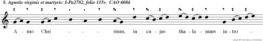 | Responsory 3: CAO 6442 Diem festum sacra tissimae Virginis celebremus: qua liter passa sit beata Agnes ad memoriam revocemus: tertiodecimo aetatis suae anno mor tem perdidit et vitam invenit: Quia solum