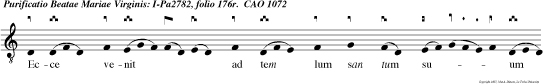 | Antiphon : CAO 3089 Hodie beata Virgo Maria Puerum Jesum prae sen tavit in tem plo et Simeon, repletus Spiritu San to, accepit eum in ulnas suas, et benedixit Deum. |