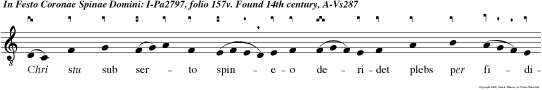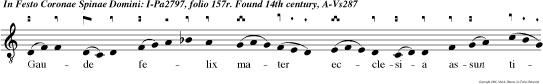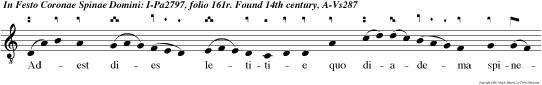 | Antiphon 1: Adest dies letitie quo diadema spineum commen datur memorie chri sti cruore roseum alleluya alleluya. Domi-n regna-v e uo a e. |