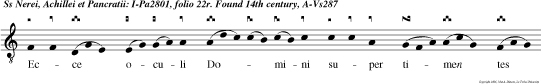 | Introit : Ecce oculi Domini super timen tes eum, sperantes in misericordia ejus, alleluia: ut eripiat a morte animas eorum quoniam adjutor et protector noster est, alleluia, alleluia. |