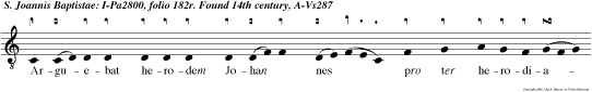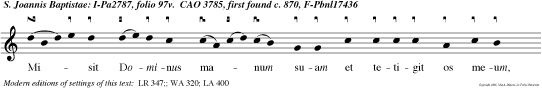 | Antiphon 5: CAO 3788 Misit rex incredulus ministru detestalem et amputari jussit caput johan nis baptiste. e u o u a e. |