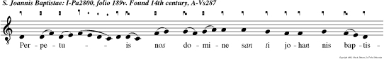 | Antiphon : CAO 4274 Perpetu is nos domine san ti johan nis baptiste tuere presi diis et quan to fragiliores l5sumus tan to magis necessariis attolle suffragiis. magnifie u o u a e. |