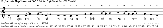 | Hymn : CAO 8406 Ut queant laxis resonare fibris mira gestorum famuli tuorum solve polluti labii reatum sancte iohannes. |