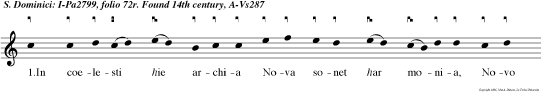 | Hymn : Hym num nove leticie dulci productum cantico noster depromat hodie chorus sancto dominico. |