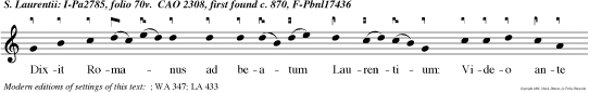 | Antiphon 3: CAO 2308 Dixit Romanus ad beatum Laurentium: Video ante te juvenem pul cher rimum festina me baptizare. |