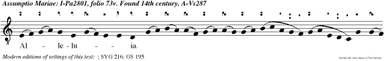 | Alleluia : Alleluia._ _ Hodie Maria Virgo coelos ascendit: gaudete, quia cum Christo regnat in aeternum |