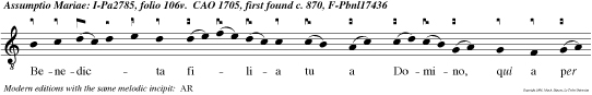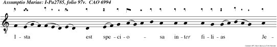 | Antiphon 1: CAO 1503 Assum ta est Maria in coelum gauden angeli, laudan tes benedicun Dominum |