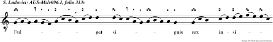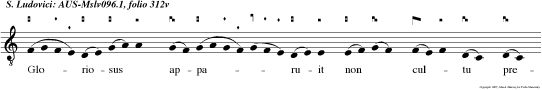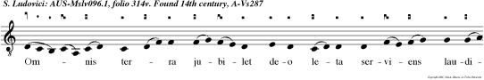 | Antiphon 1: Ludovicus decus reginantium transiit felix ad celi solium cuius prece cetus fidelium summi regis intret in gaudium. |