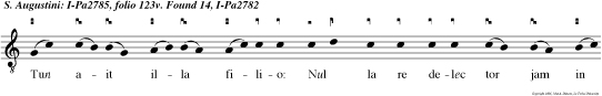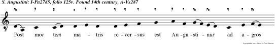 | Sequence : 1.De profun dis tenebrarum Mun do lumen exit clarum Et scintillat hodie: Olim quidem vas erroris, Augustinus vas honoris Datus est ecclesiae. 2.Ver bo Dei dum obedit, Credit erran et accedit Ad
