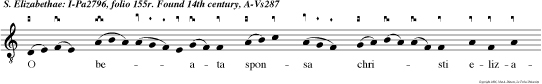 | Antiphon 1: O be ata sponsa christi elizabeth que meruisti ap? rege? angelorum suscitatrix mortuorum fieri quam plurium felix tui de pressio sup bis fit repressio et robur humilium tu pro nobis mat? pia roga