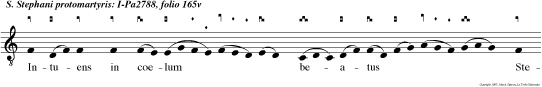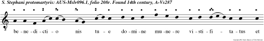 | Antiphon 1: CAO 2396 Domine virtus et letitia rectorum quoniam prevenisti dilectum tibi stephanum dono gratuite benedictionis te primum secutus est morte gloriose passionis unde cum corona martyrum dedisti