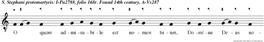 | Antiphon : CAO 4064 O quam gloriosus est beatus stephanus martyr et levita qui ante apostolos regna celestia possidere meruit et ad patris desteram filium videre. O quam gloriosus est beatus stephanus ,artyr