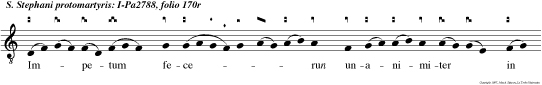 | Responsory 3: CAO 6887 Inipu super vistum iacturam fecerunt ut e um morti trade rent. At ine gaudens suscepit lapidens ut mereretur accipe re coro nam glori e. |